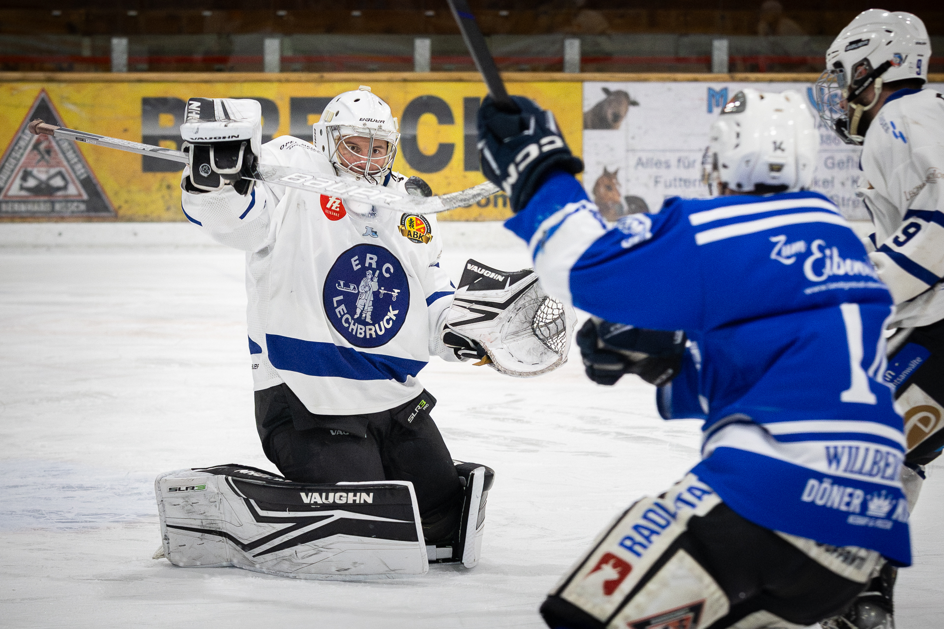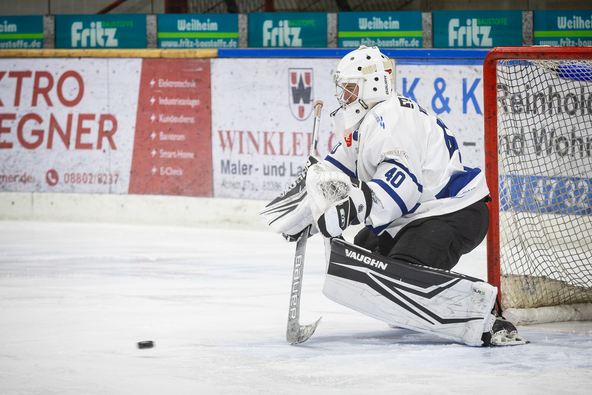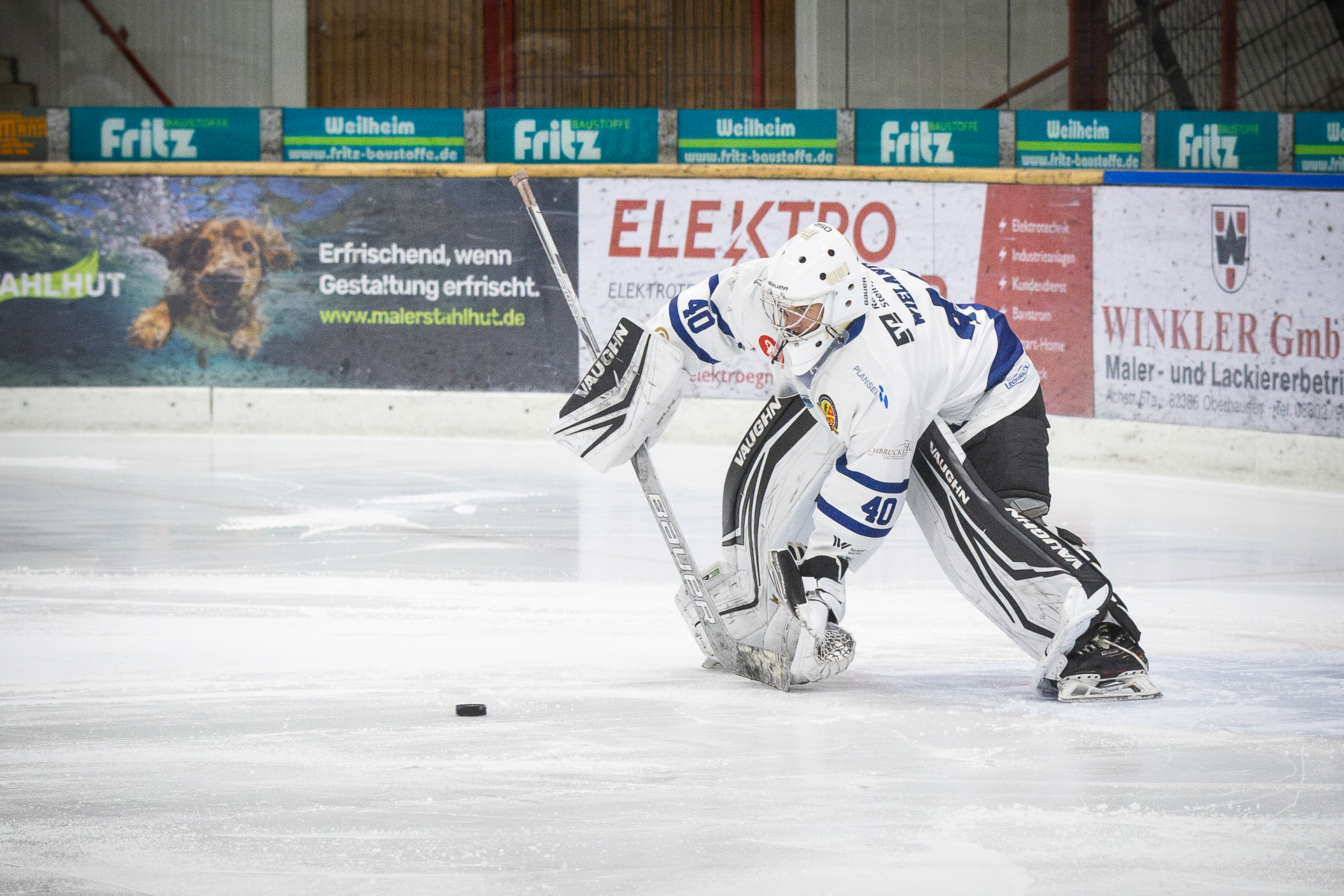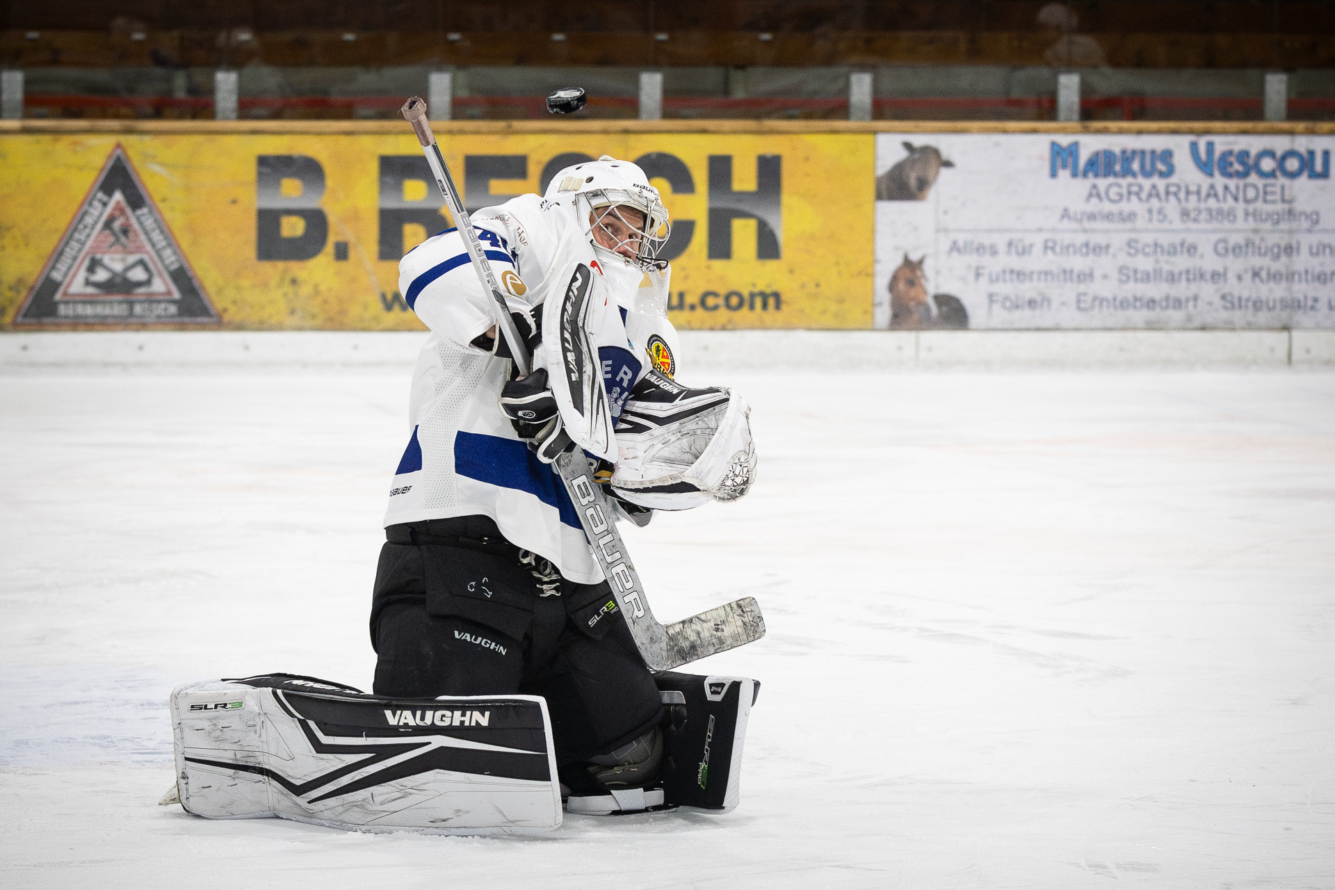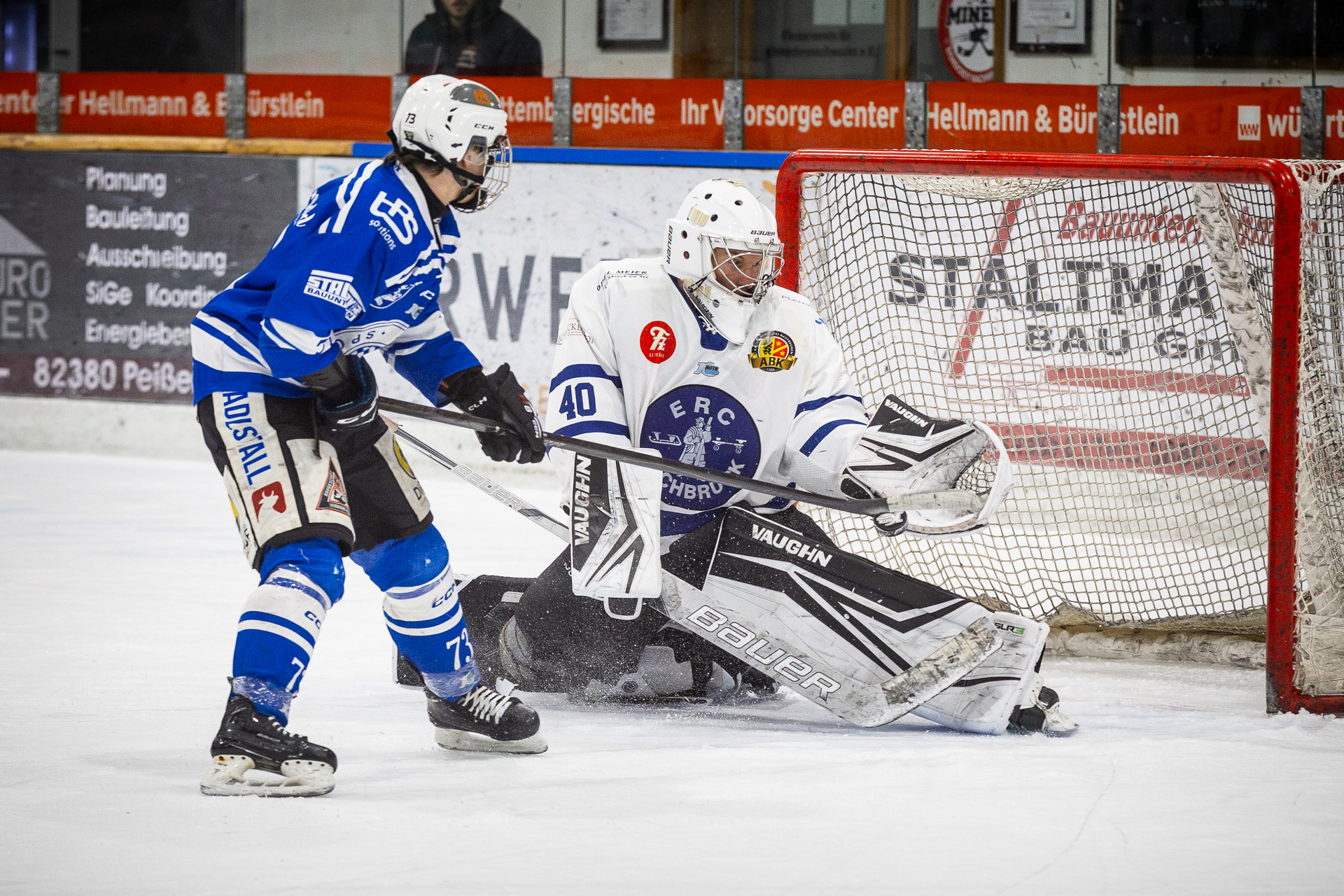 Diepolder EC Peiting trifft gegen EX ECP Goalie Andreas Magg (HC Landsberg)
