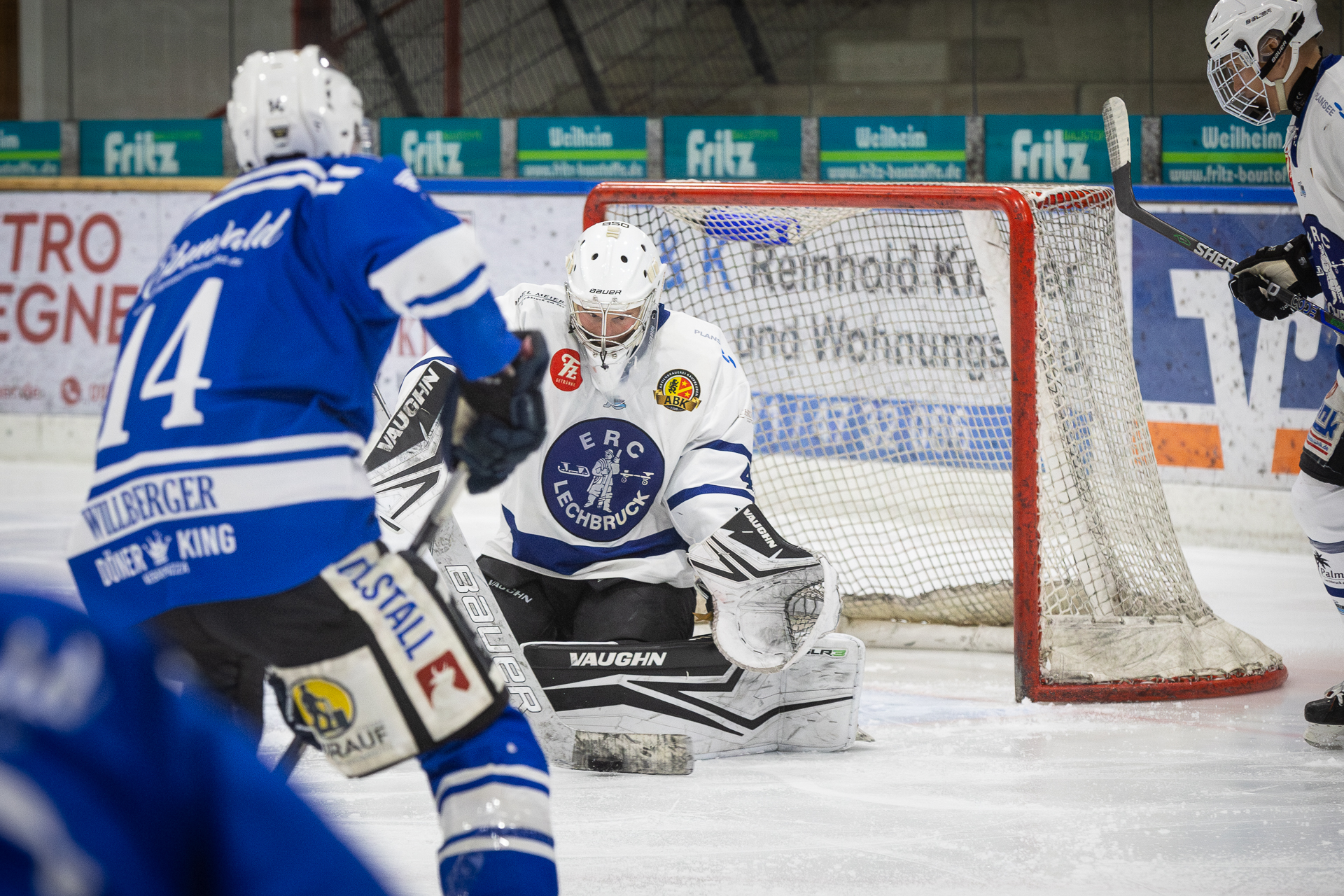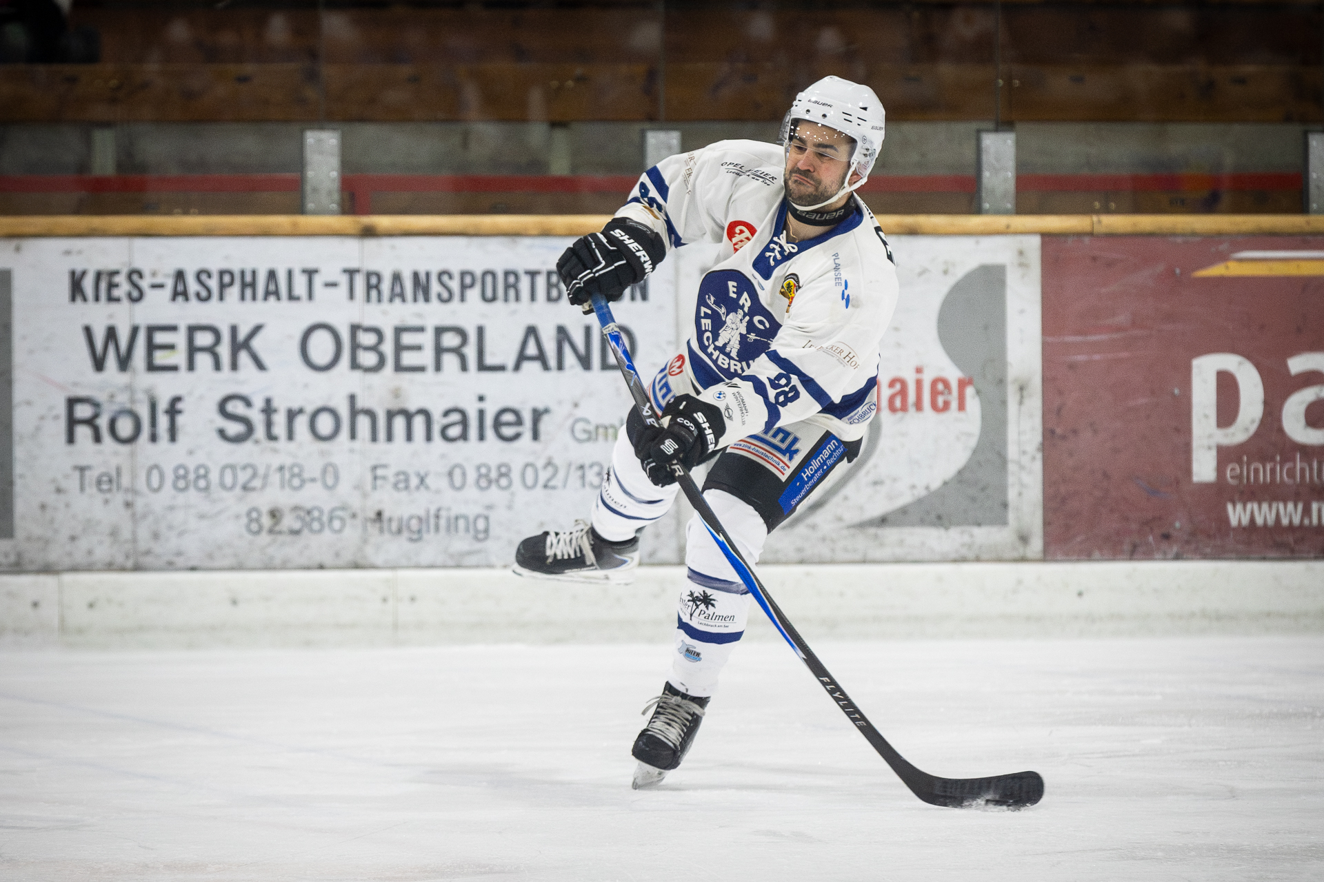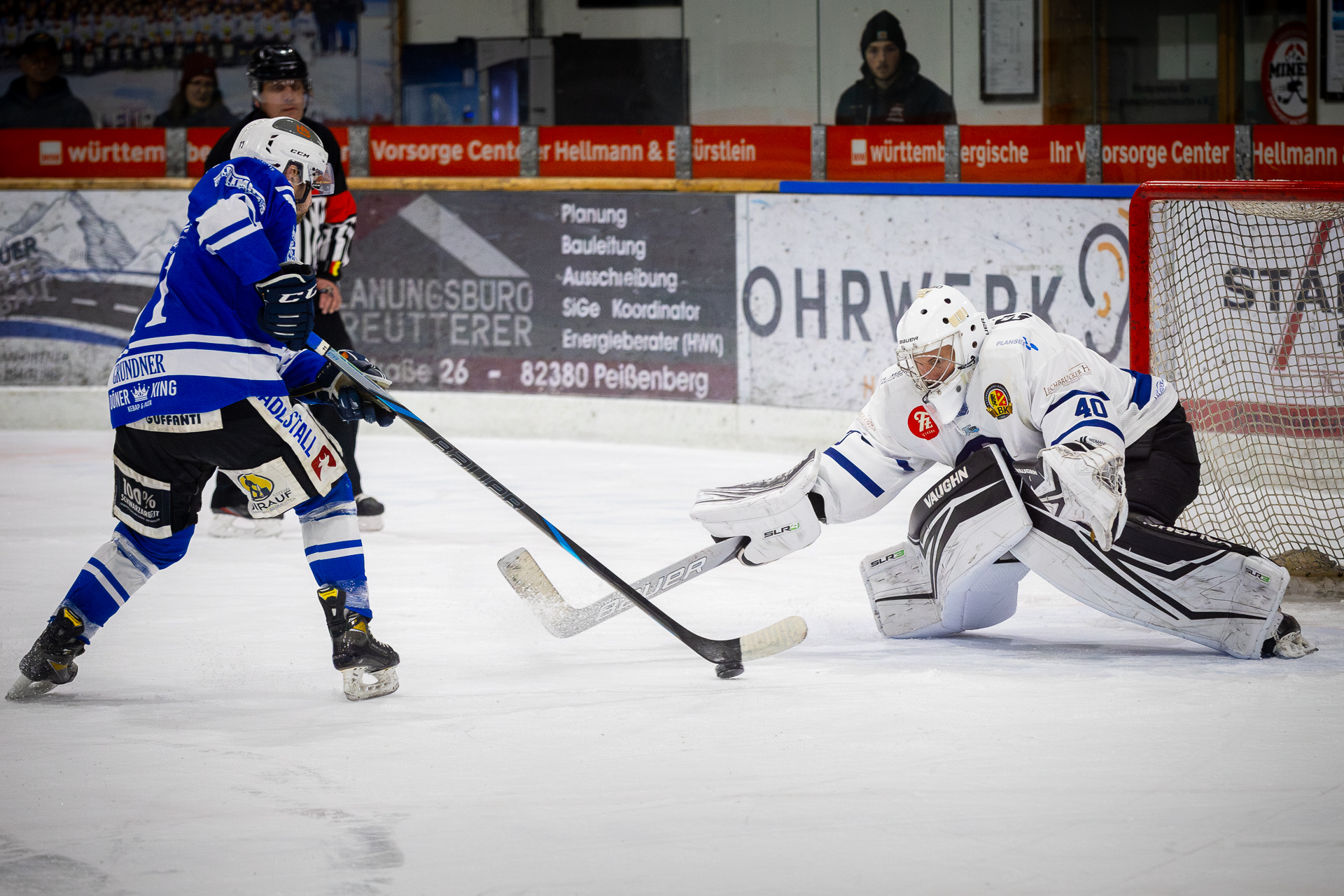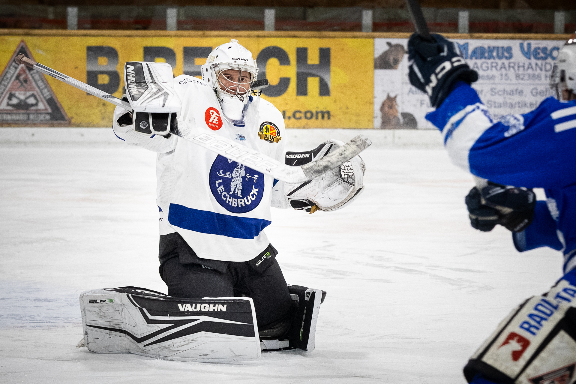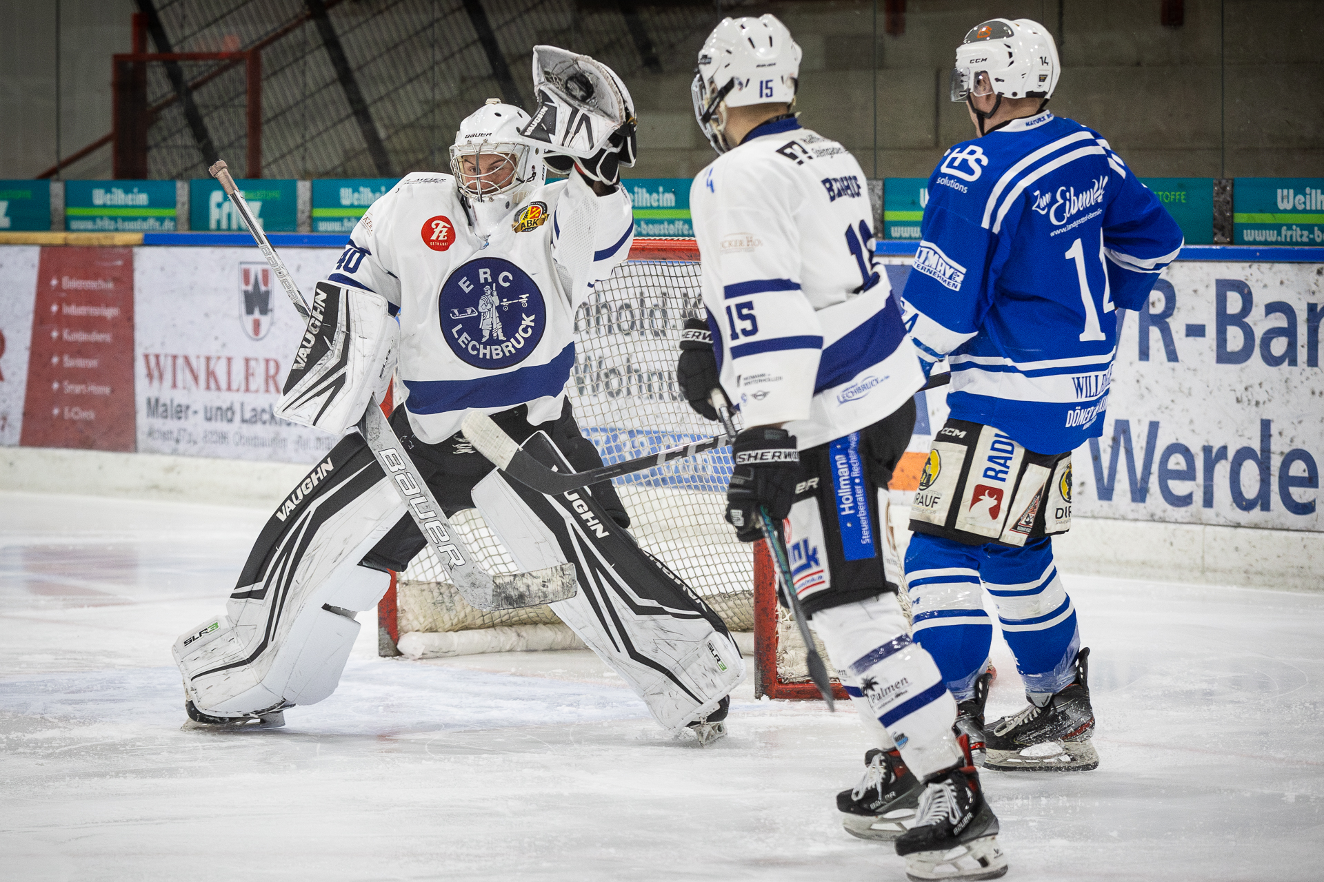 Diepolder EC Peiting trifft gegen EX ECP Goalie Andreas Magg (HC Landsberg)