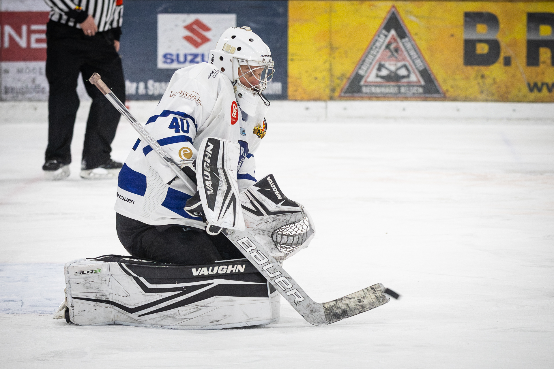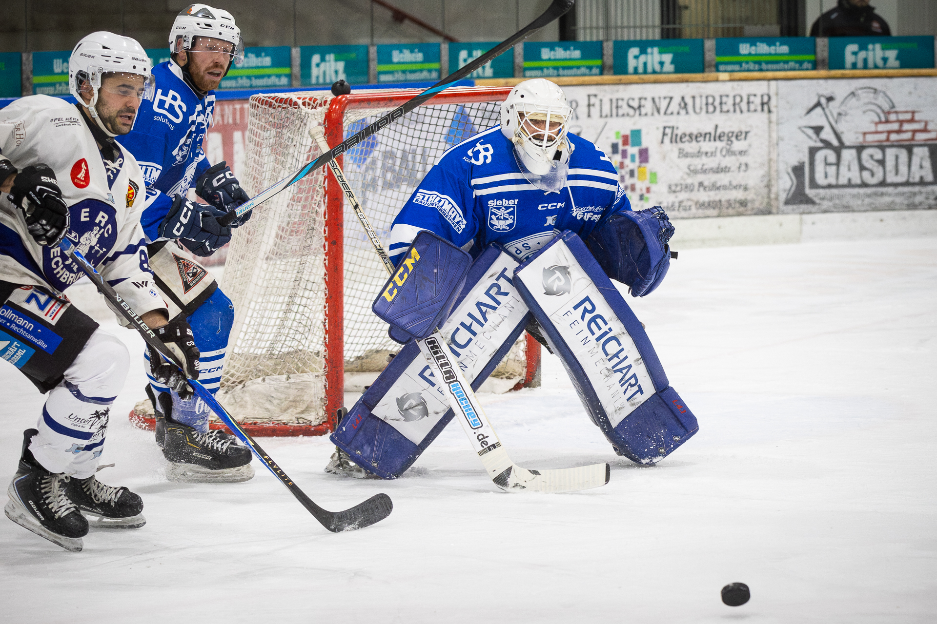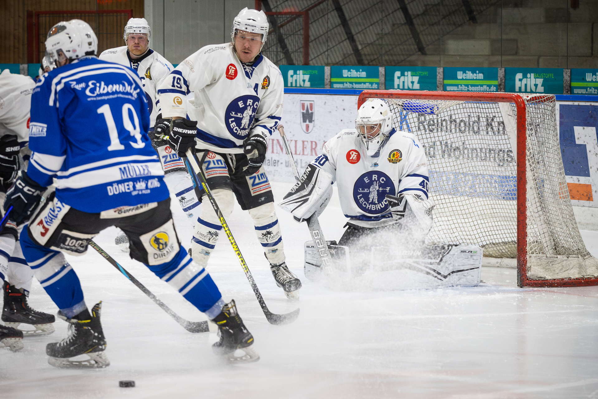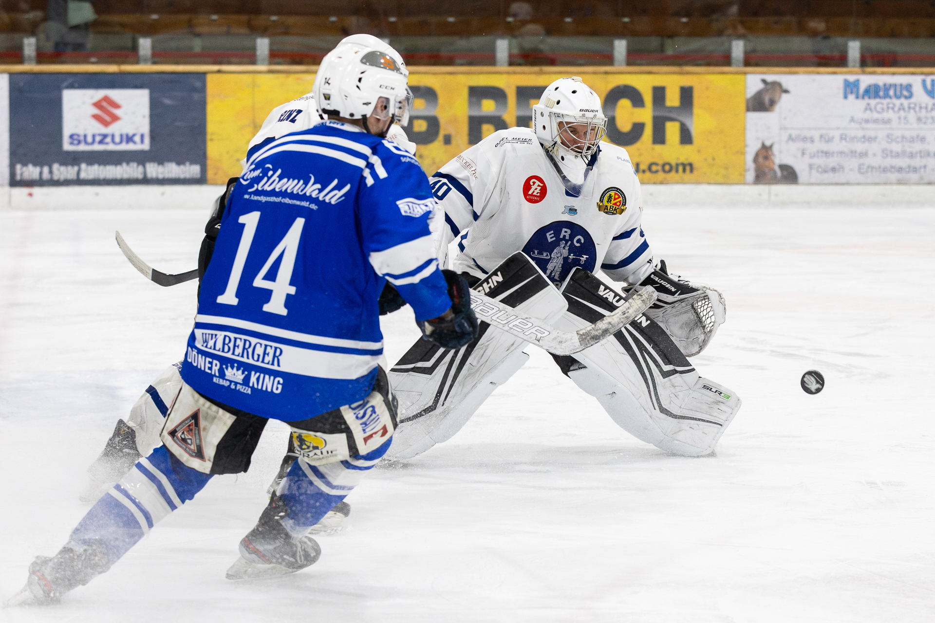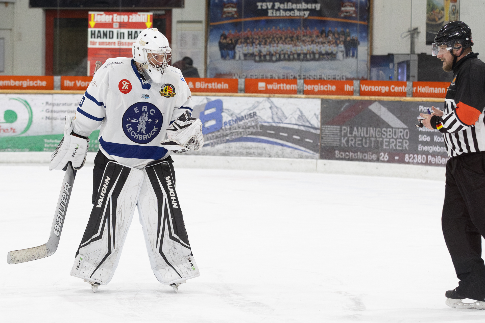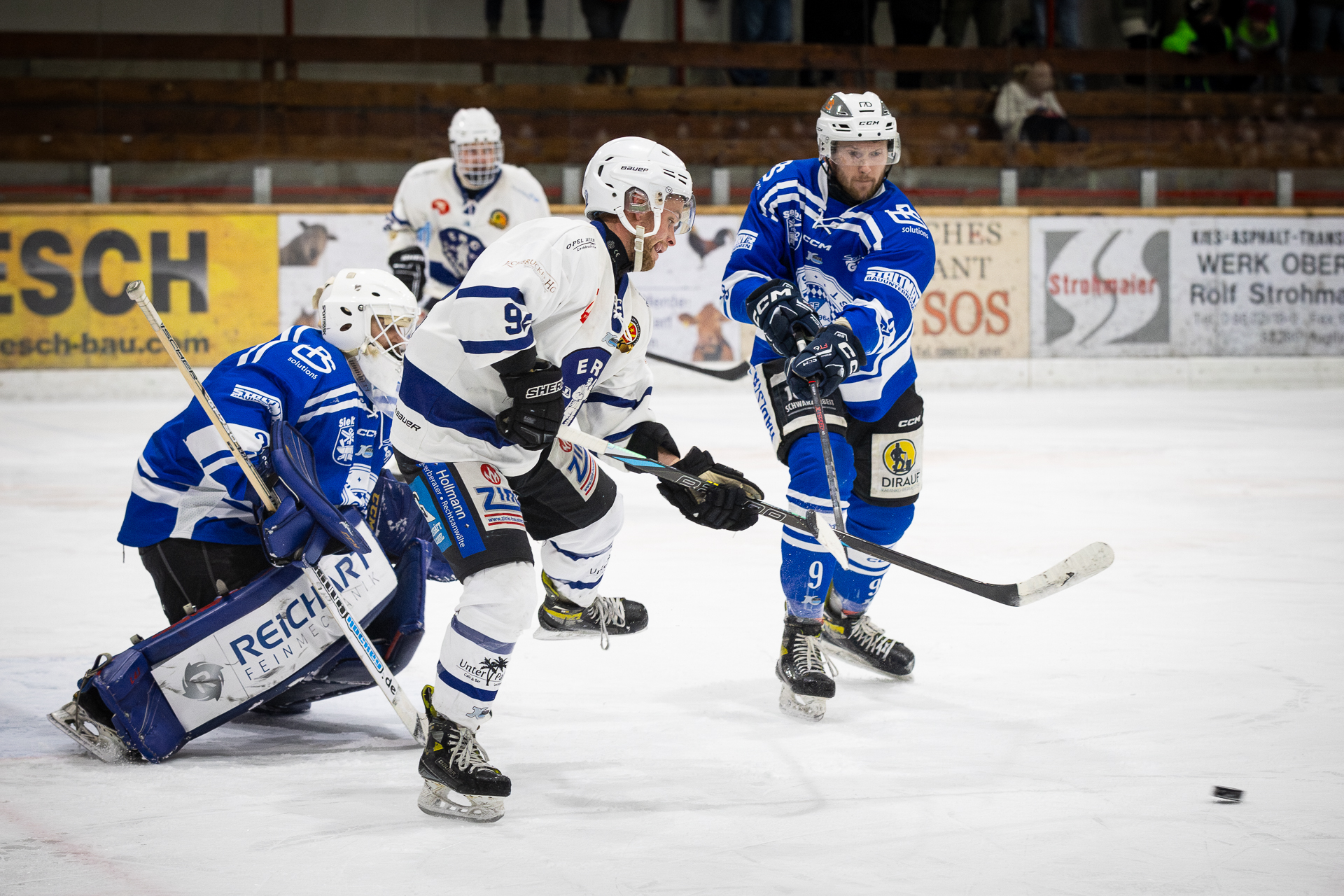 Diepolder EC Peiting trifft gegen EX ECP Goalie Andreas Magg (HC Landsberg)