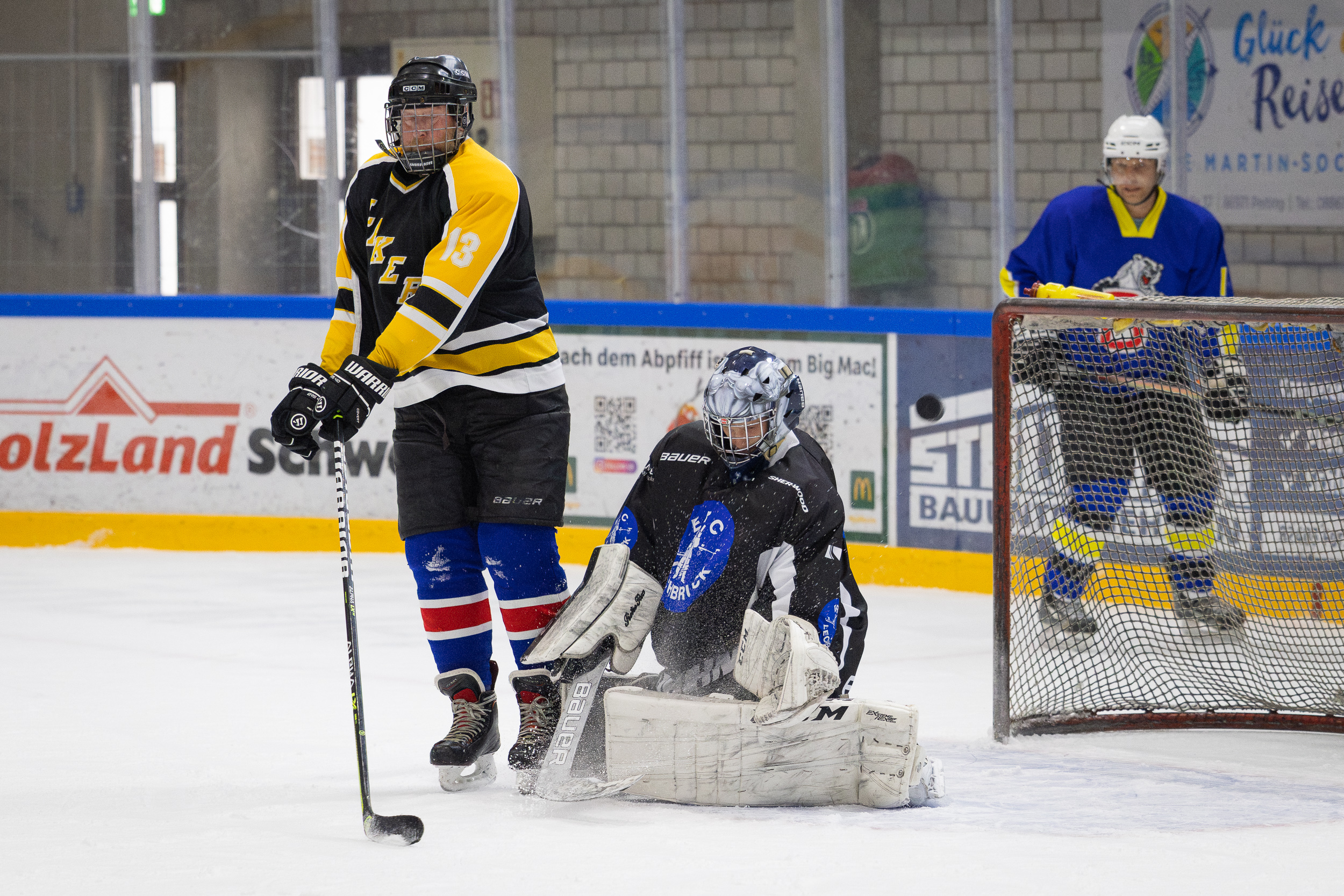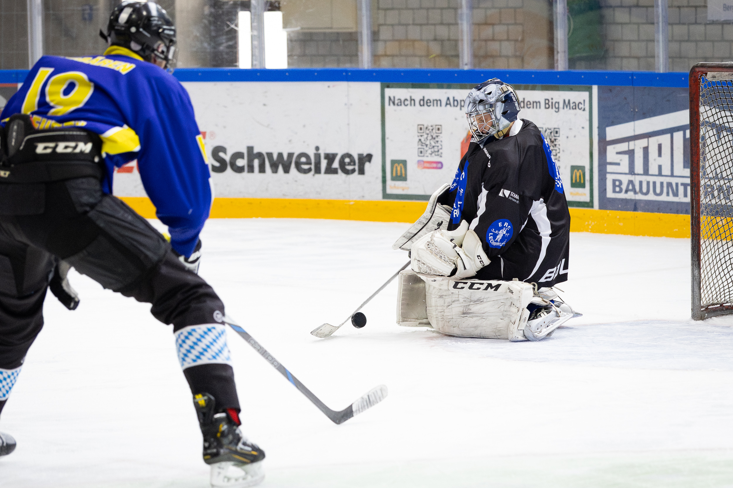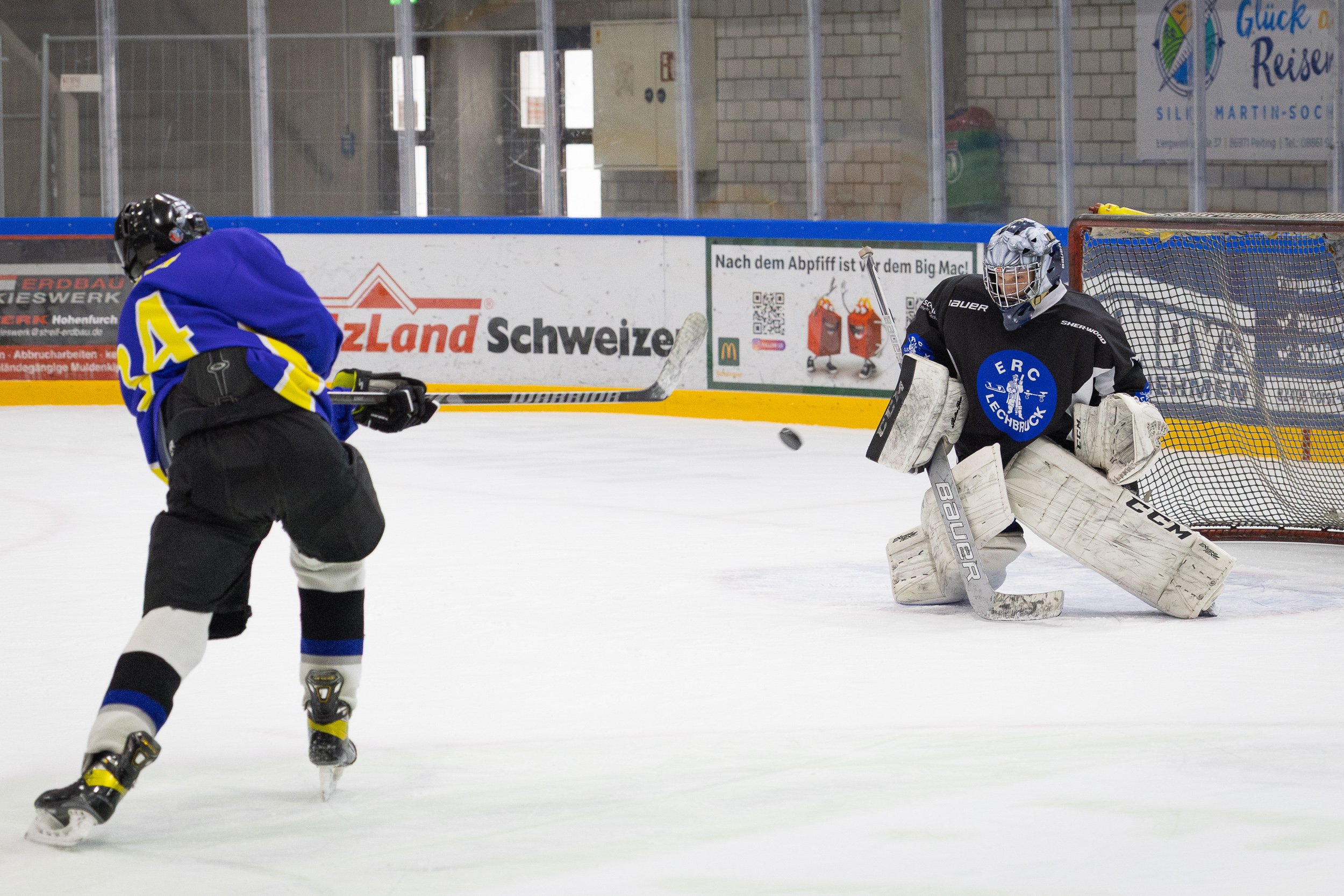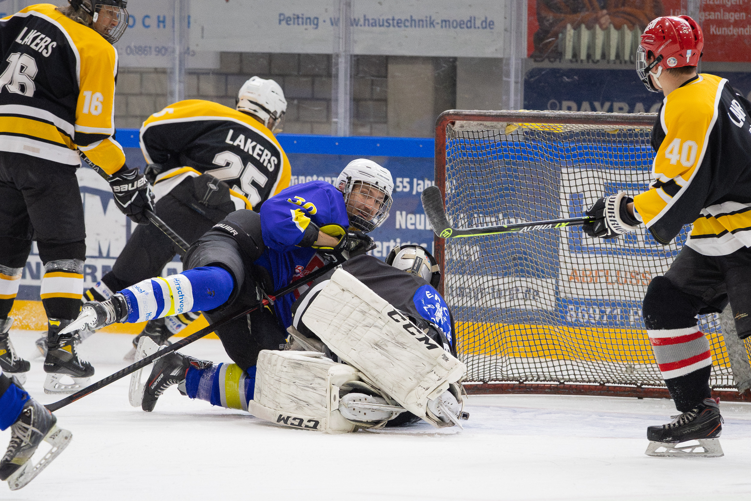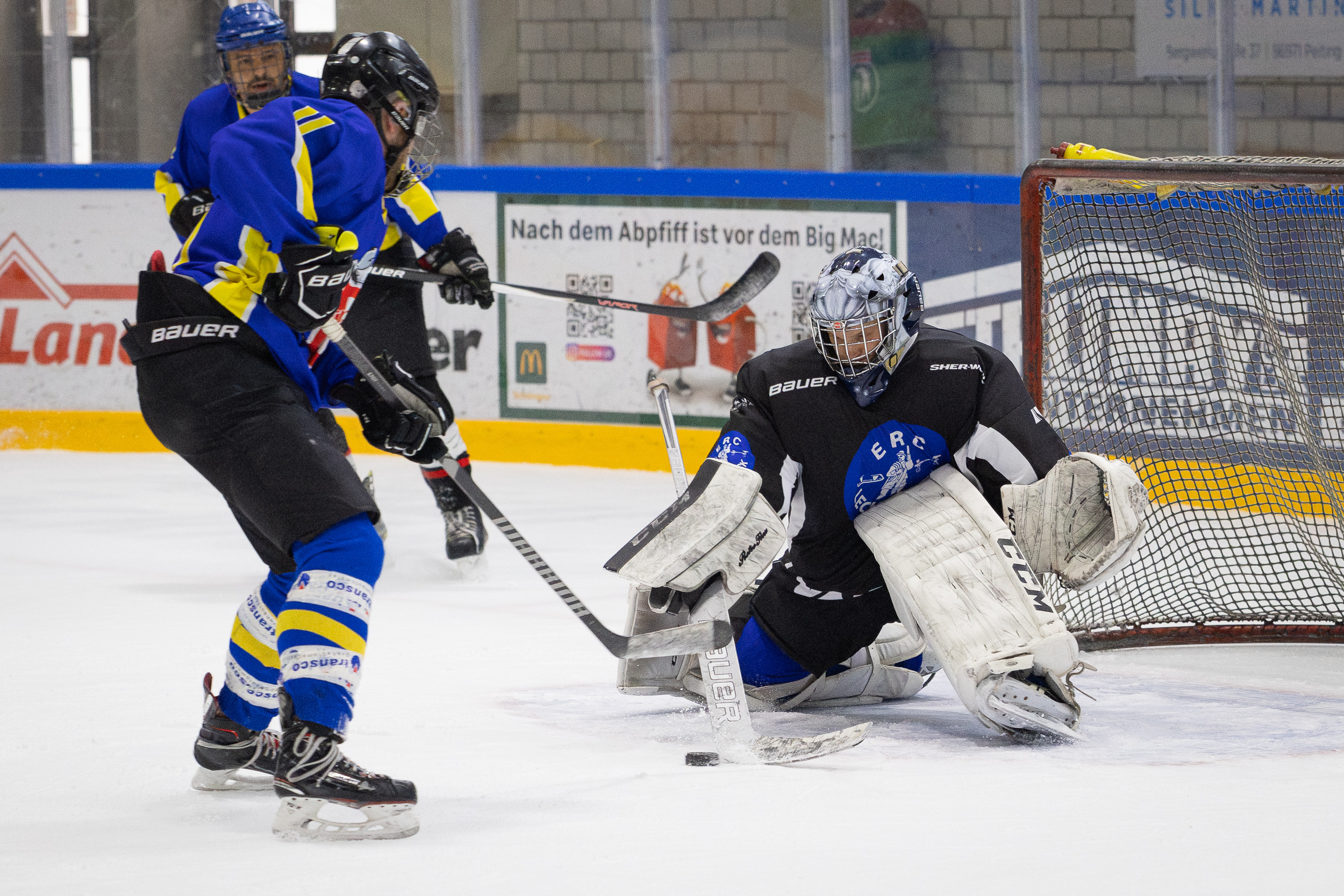 Diepolder EC Peiting trifft gegen EX ECP Goalie Andreas Magg (HC Landsberg)