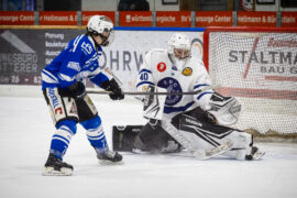 Diepolder EC Peiting trifft gegen EX ECP Goalie Andreas Magg (HC Landsberg)